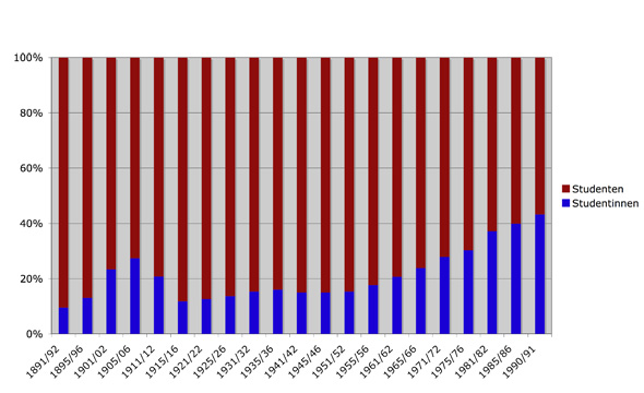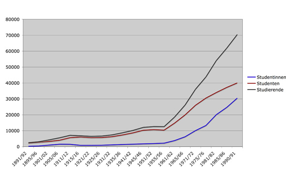 Grafik: Studierende an Schweizer Universitäten nach Geschlecht 1891-1991