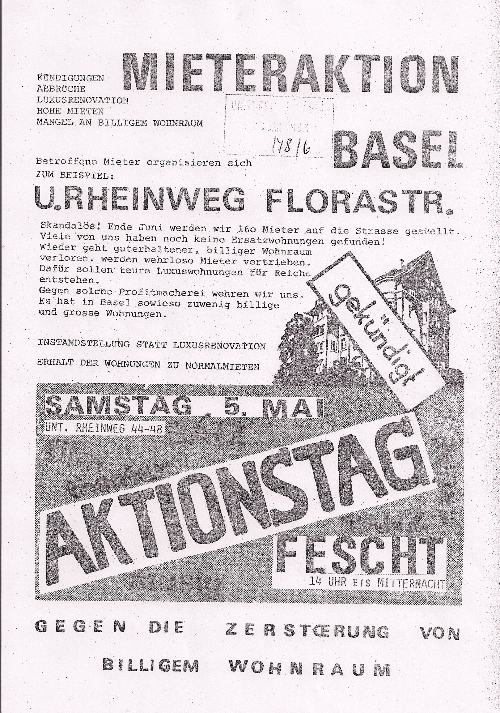 Im Juni 1977 erhielt die WoVe die Kündigung für das «Grossobjekt» am Unteren Rheinweg und an der Florastrasse. Etwa 100 Mieter der WoVe waren von der Kündigung, die ein privater Besitzer ausgesprochen hatte, betroffen. In einer Gerichtsverhandlung wurde das Mietverhältnis zwar bis zum 30. Juni 1979 verlängert, die Mieter liessen es sich aber nicht nehmen, auch aussergerichtlich gegen den Abbruch vorzugehen. Am 5. Mai 1979 fand ein «Aktionstag» in Gestalt eines Festes am Unteren Rheinweg mit Film, Theater, Tanz, «Musig» und «Baiz» statt. Auf dem Flugblatt zum «Fescht» liessen die Initianten verlauten: «Wieder geht guterhaltener, billiger Wohnraum verloren, werden wehrlose Mieter vertrieben. Dafür sollen teure Luxuswohnungen für Reiche entstehen. Gegen solche Profitmacherei wehren wir uns!»