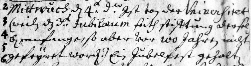 Ein Augenzeugenbericht zur ersten Jubiläumsfeier 1660Ein Anonymus schrieb 1660 in seinen Schreibkalender zum 4. April: «Mittwuch den 4.t dito ist von der Vniversitet (weilen dz 3t. Jubilaeum seith stiftung derselb anfange, so aber vor 200 Jahren nicht gefeyret worden) Ein Jubelfest gehalten worden: Am morgen umb 7 Uhr sindt sie in der procesion in die Kirchen gezogen ins Münster. Alwo H. Pfarrh. Götz, weilen der Oberstpfarrherr Gernler Rector war, die Predig auß 122 Psalm gethan. Nach der Predig sind sie wider ins Ober Colleg. gezogen: Gegen 10 Uhr ins Auditorium Theol. im Münster gegangen, da dan Hr. Gernler eine Oration biß nach den XII Uhr gehalten; hernach mit den Anwesenden HH. Deputaten undt Rähten, mit dem Scepter ins Colleg gezogen, undt daselbsten Mahlzeit gehalten. Waren 2 Tafeln voll undt ¾ Tisch, sindt etl. Tisch, so zu viel bereittet waren, auffgehebt worden: Amen.» |