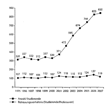 Dieser Wunsch ging bisher nicht in Erfüllung. Es erstaunt deshalb wenig, dass die Jahresberichte seit 2003 mit der zumeist gleichlautenden Klausel über die Herausforderungen des studentischen Zustroms schliessen: «Die Zahl der Studierenden nimmt weiterhin zu; die damit einhergehenden Belastungen sind unvermindert nur mit dem engagierten und grossen Einsatz der Mitarbeiter/innen zu bewältigen.»