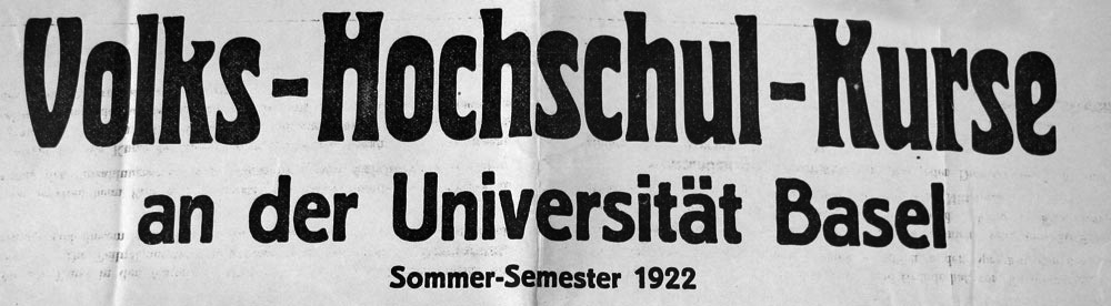 Im Oktober 1919 öffnete sich die Universität Basel dem breiten interessierten Publikum. Der Idee der ‚University Extension' folgend, die sich um die Mitte des 19. Jahrhunderts in England entwickelt hatte, sollten die Erkenntnisse der Wissenschaft popularisiert und breiten, auch weniger privilegierten Bevölkerungskreisen zugänglich gemacht werden. Die Volkshochschulkurse der Universität Basel übernahmen in den darauf folgenden neunzig Jahren diese Aufgabe. Die Gründer der Volkshochschulkurse der Universität Basel, der Altphilologe Johannes Stroux und der Botaniker Gustav Senn, lehrten als Professoren an der Universität Basel. Organisatorisch waren die Volkshochschulkurse der Universität angegliedert. Das Sekretariat für die Anmeldungen befand sich im Kollegiengebäude am Petersplatz, und die Kurse, hauptsächlich Vorträge, fanden in den Uni-Hörsälen statt. Die «Kommission für die Volkshochschulkurse», zuständig für die Kursprogramme, bestand hauptsächlich aus Universitätsprofessoren, und jede Fakultät war darin vertreten. Ausserdem waren ein Erziehungsratsmitglied und ein Vertreter der Kuratel sowie zwei bis drei Vertreter der Hörerschaft beteiligt.