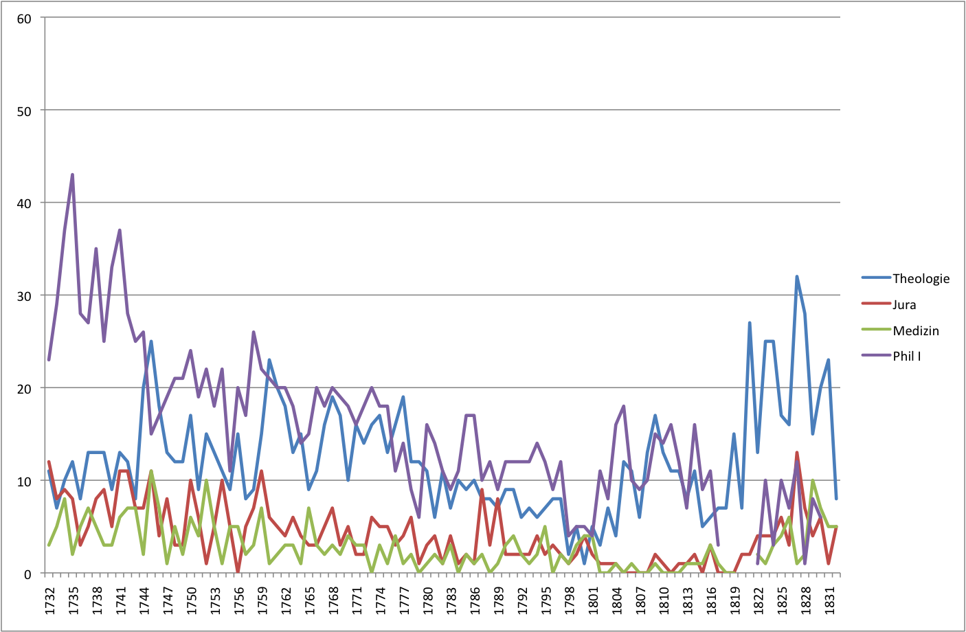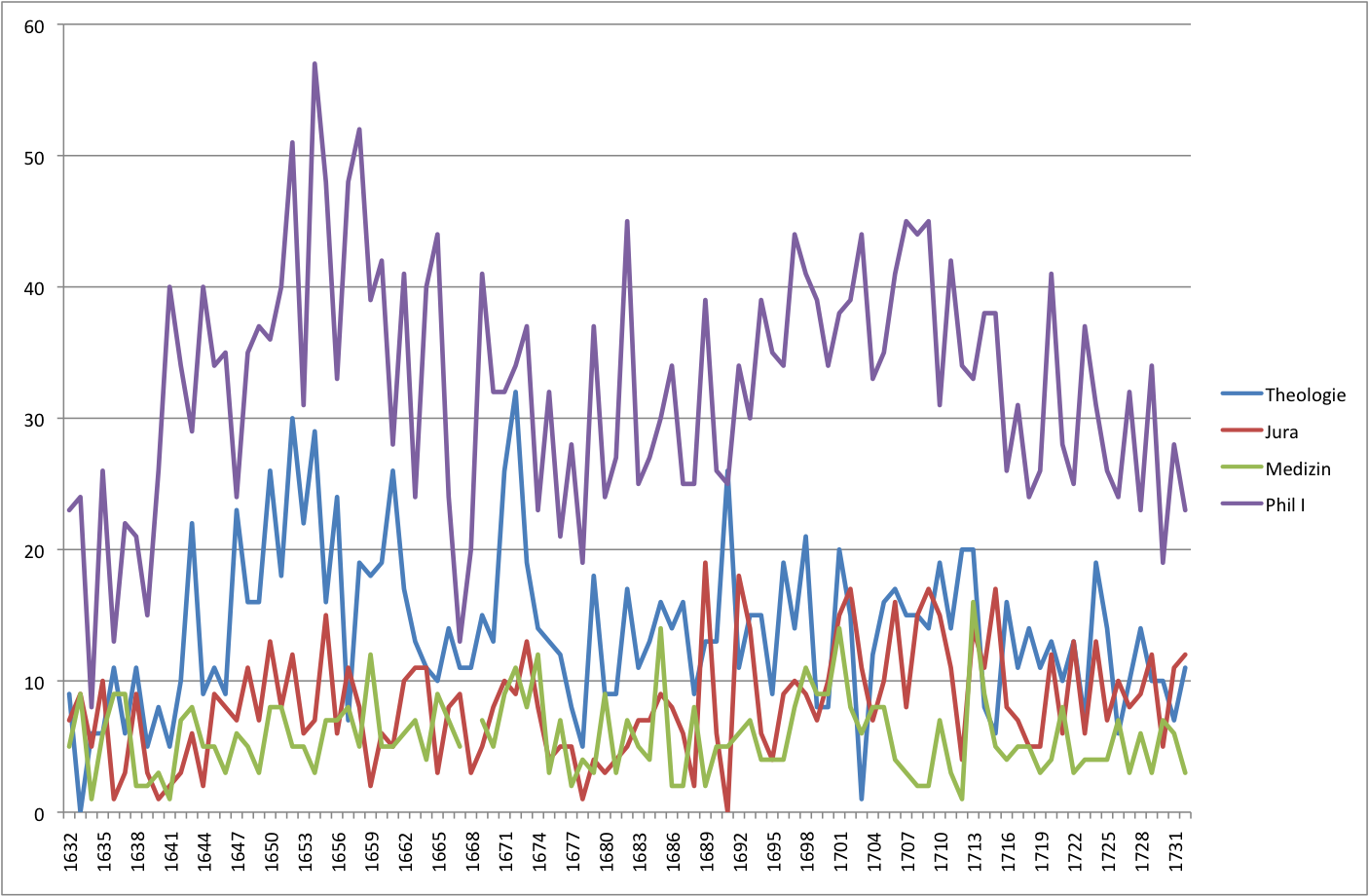 Studierendenzahlen nach FakultätenStudierende in den einzelnen Fakultäten 1632-1732