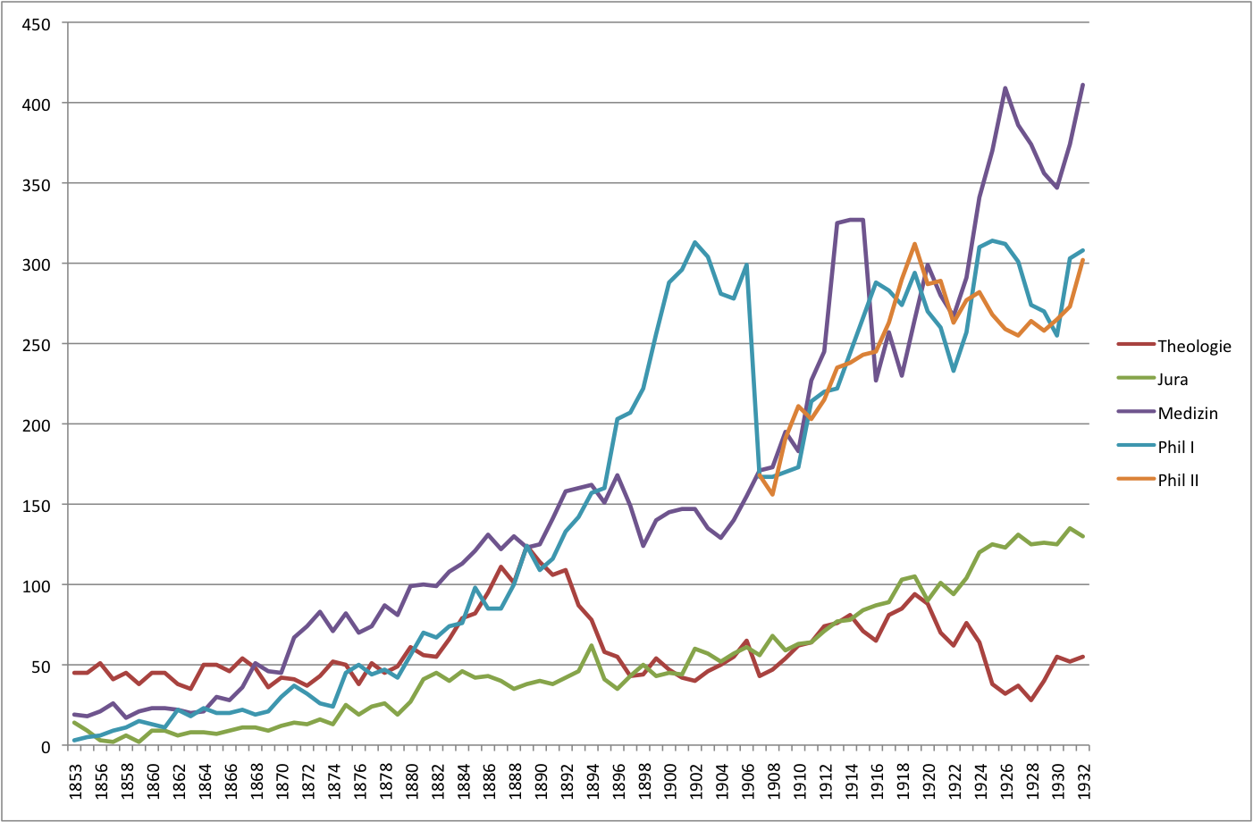 Studierende in den einzelnen Fakultäten 1853-1932 (Für die Zeit zwischen 1832 und 1853 konnten keine Zahlen zu den Fakultäten gefunden werden).